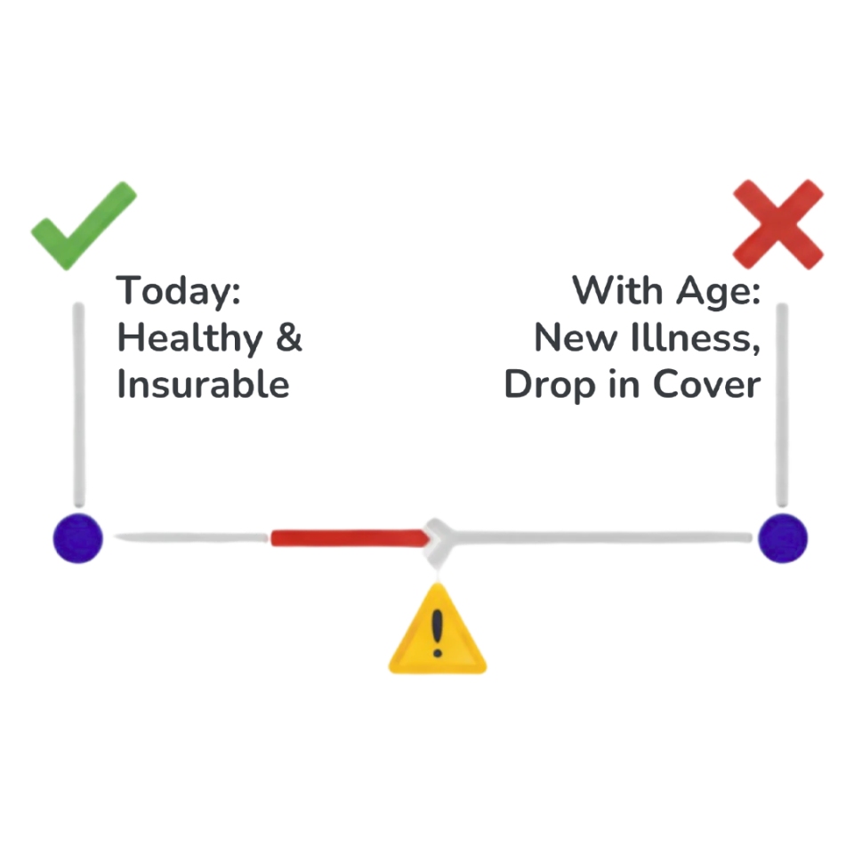 Reality: Premiums rise with age; new illnesses can mean exclusions, longer waiting periods, or even rejection. Starting later also delays PED waiting clocks.